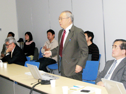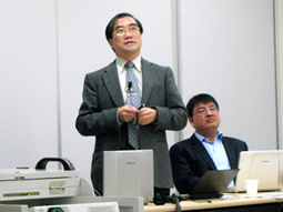 생존권연구소의 연구를 소개하는 고마쯔(小松) 교수 |