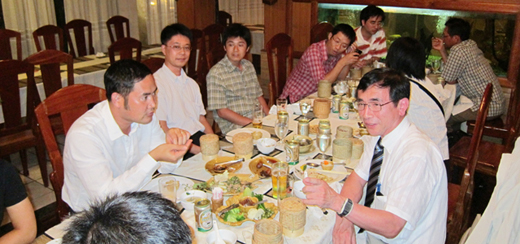 친목회에는 Kyoto University Network in Laos 회장의 Dr. Thatheva Saphangthong(2007년, 대학원 아시아•아프리카 지역연구 연구과 수료)을 비롯한 Kyoto University Network in Laos의 멤버에 그리고 모리(森) 부이사 그 외 본 대학에서의 참가자, 라오스에서 조사연구를 실시중인 본 대학 대학원생이나 고우노 야스유키(河野 泰之) 동남 아시아 연구소 교수의 현지 조사 팀의 멤버 등 합계 14명이 모였습니다. 모리(森) 부이사의 발성에 의한 건배 후 라오스의 현지 요리를 즐기면서 환담하고 라오스에 있어서의 동창회 활동의 앞으로의 발전을 어떻게 실현할 것인지를 의견교환이 잘 진행 되었습니다.