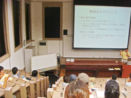 대학간 학생교류 협정교의 교환유학예정자나 해외연수 등에 참가할 예정이 있는 본 대학 학생을 대상으로 실시된 본 설명회에서는 국제교류 센터 교원으로부터 해외생활에 잠재하는 여러가지 위험성과 그 예방책,또 보험가입 등에 관한 강연이 있었으며, 안심하고 해외에 갈 수 있도록 자발적으로 최신의 해외안전정보를 입수하기 위한 여러가지 어드바이스가 제공되었습니다. 참가자는 「국제교류 안전 가이드(도항편)」를 보면서 설명을 열심히 듣고 결실이 많은 유학•연수를 계획하면서 도항전 준비의 일환으로서 해외에서의 자기방위•위기관리에 대한 의식을 높일 수 있었습니다.