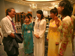 베트남 국가대학 하노이 공동사무소 개설기념 리셉션에서 니시무라 슈조 이사•부학장과 함께 있는 아오자이(ao dai) 옷을 입고 있는 수강생들 |