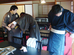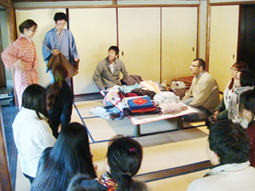 ◆2010년11월16일 유학생 라운지 기즈나 「기모노를 입는 법 교실」을 개최했습니다. 「기즈나」의 11월의 이벤트로서 교토대학 다도문화연구회의 협력을 받아 「기모노를 입는 법 교실」을 세이후우소(淸風莊)에서 개최했습니다.