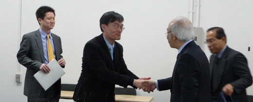 악수하는 Ruey-Jen Yang 본부장과 마키노 산관학 연계본부장 |