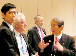 의장인 캘리포니아대학 산타바버라교 Henry T. Yang학장의 의사 진행 하에 APRU의 새로운 사무국장 선출, APRU이사회 구성 멤버, 2010-2011년 재무 및 사업활동 보고 등에 관해서 심의했습니다. APRU이사회 구성 멤버에 관해서는 마쓰모토 총장이 2009년 7월부터 아시아 일본 의석 이사회 멤버로서 2년 동안 역임했습니다만 본회의에서 2013년 6월까지 임기 연장을 승인받았습니다. 또한 현재 공석인 라틴 아메리카와 아시아 전체 의석인 2자리에 관해서도 심의함과 동시에 이사회 멤버의 선발 규정이 정해져 멤버 선발의 투명성을 높였습니다. 2010-2011년 사업보고에서는 작년 11월 24일~26일 일정으로 본학 생명과학연구과와 물질-세포통합시스템거점(iCeMS)이 중심이 되어 개최한 APRU 리서치 심포지엄 ‘Interface between Molecular Biology and Nano-Biology’ 보고가 있었습니다.