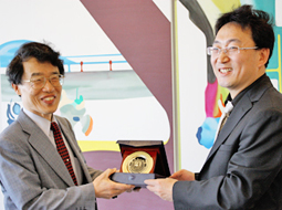 양 부원장(오른쪽)으로부터 기념품을 전달받는 고모리 연구과장(왼쪽) |