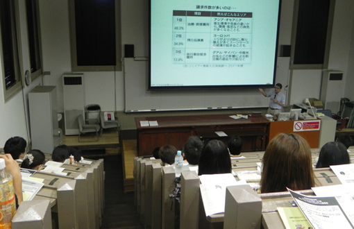 해외 생활 중에 일어날 수 있는 안전면, 건강면, 정신면에서의 위험성이나 범죄사례, 그 대책에 대한 국제교류센터 교원의 강연이 있었고, 걱정없는 쾌적한 유학, 해외연수를 위한 안전에 관한 정확한 지식과 정보수집의 중요성, 그리고 보험가입의 중요성에 대해 전달하였습니다. 대학간 학생교류협정교로의 교환유학이나, 단기유학 프로그램에 참가를 예정하고 있는 학생을 중심으로, 설명회장에 모인 56명의 참가자들은, '국제교류안전가이드(도항편)'책을 손에 들고, 강연을 들으며 위험의 실태를 이해하며 안전의식을 높혔습니다.