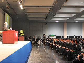 2013년도 학부 입학식을 '미야코멧세'에서 거행했습니다. 입학식에는 학가 제창에 이어서, 마쓰모토 히로시 총장의 축사가 있었습니다.