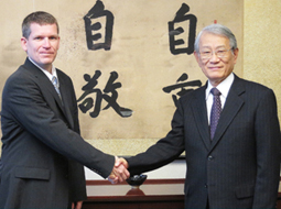 요하네스 하인라인 에덱스(edX) 어소시에이트 디렉터와 악수를 나누는 마쓰모토 히로시 총장 |