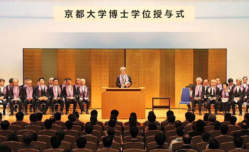 学位的取得,是对各位同学过往刻苦钻研的回报。想必同学当中,有人曾多次受挫,也有人天天烦恼吧。特别是各位留学生,你们要在语言文化不同的异国他乡学习,付出的努力非同小可。但大家最终克服重重障碍,修习专业知识,在自己的专业领域中获得了自立能力,这一切都在今天京都大学博士学位授予仪式上得到了肯定。各位同学今后无需畏惧任何人,应当发挥长期锤炼的个性,充分利用学到的专业知识,解决世界所面临的课题。在这个急剧变化的时代,大家即将要踏入的世界里或许有着前所未有的困难在等着你们。但是,你们今天取得的学位必将赐予你们攻克难关的强大依据和自信。希望大家能有效利用过往的研究成果来应对专业领域及世界的各种变化,走向散发灿烂光芒的辉煌人生。
