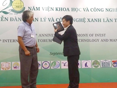 On 4 September, the Graduate School of Global Environmental Studies (GSGES) held a ceremony marking the 10th anniversary of its Hanoi office, located at Hanoi University of Science and Technology's (HUST's) School of Environmental Science and Technology (INEST). The ceremony was held as part of INEST's 20th anniversary celebration, which coincided with the eighth International Forum on Green Technology and Management (IFGTM), held 4-5 September at HUST's Ta Quang Buu Library. Attending from GSGES were eight officials including Dean Shinya Funakawa, Professors Shigeo Fujii and Yoshizumi Kaji, and Associate Professors Izuru Saizen and Yosuke Sakamoto.