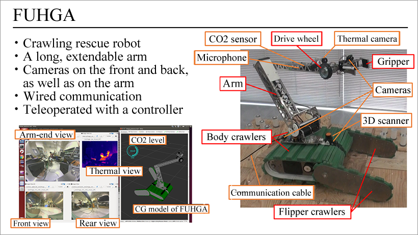 FUHGA is a rescue robot with a powerful and dexterous arm. It won the 2017 and 2018 RoboCup Japan Open's Rescue Robot League, while placing fourth and earning the Best in Class Dexterity award in the 2017 RoboCupRescue Robot League (it did not enter the 2018 RoboCupRescue competition). In the 25-26 July operations, the robot crawled inside two buildings — the wrecked home surveyed by the ImPACT Snake Smooth Type, and a severely damaged, closed-off apartment building — where in the latter it successfully recovered an item requested by a former resident.