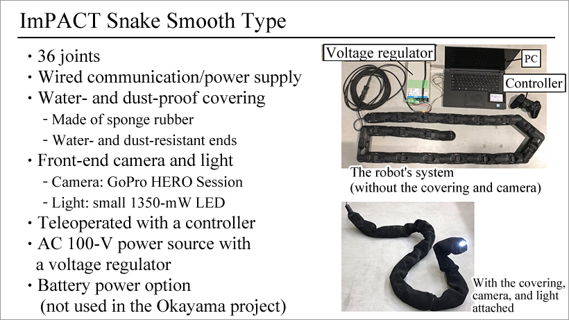 The ImPACT Snake Smooth Type is the world's first snake-shaped robot that has successfully climbed up and down a ladder. In the Okayama project, this water- and dust-proof machine was sent into a destroyed home in danger of a secondary collapse, and remote-controlled to explore the interiors.