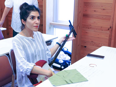 One of the instructors discussing the shamisen's structure by taking one apart into three pieces