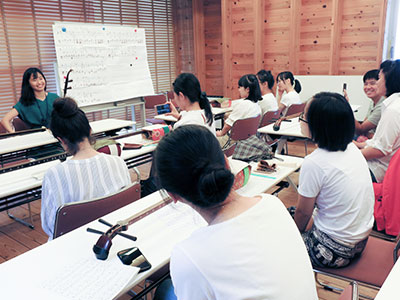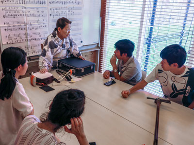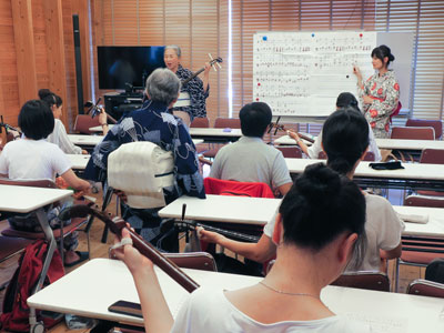 In the 6 August event, participants first listened to the instructors' performance of nagauta "Miyako-dori" (bird of the capital), and then attended a brief lecture. The presentation included a discussion of the materials used to construct the instrument, and was followed by a lively Q&A, where participants were intrigued to learn that shamisen need constant fine-tuning due to their silk strings, which are highly sensitive to temperature and humidity. Later, the students split into shamisen and nagauta groups, and took turns practicing the song "Sakura Sakura".