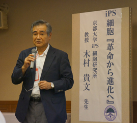 Kyoto University Tosa-Yoshida Alumni is an association of Kyoto University graduates residing in Kochi Prefecture (including those who have completed a course). With Mr. Hiroshi Masui from the secretariat (1984 graduate, Faculty of Engineering) serving as the master of ceremonies and about 120 members and visitors in attendance, the lecture session opened with a speech by Chair Saburo Ohnishi (1969 graduate, Faculty of Medicine). Then, Professor Takafumi Kimura (Center for iPS Cell Research and Application) gave a lecture, titled "iPS Cells: From Revolution to Evolution." Joined also by many non-members, the session sparked great enthusiasm, especially among junior and senior high school students who asked eager questions.