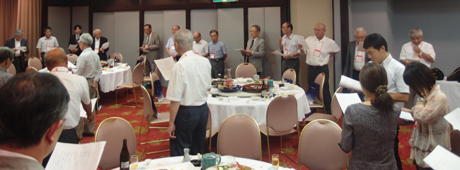 After the lecture, a social gathering was opened with a toast by former Chair Toshio Furuya (1952 graduate, Faculty of Letters), after which members enjoyed mingling together. At the end of the party, the participants all sang Biwako Shuko no Uta and the meeting ended on a happy note.