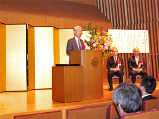 Around 250 people attended the ceremony and lectures, which were given by Professor Toshitaka Tsuda, Director of RISH, Professor Emeritus Tetsuya Sato of the National Institute for Fusion Science, and Professor Emeritus Mitsuyoshi Yatagai from the University of Tokyo. Professor Tsuda spoke on the theme, "Invitation to the Science of Humanosphere: Ten Years of Research Achievement in Summary", based largely on the book of the same title published as part of the anniversary celebration, while the speeches by Professors Emeritus Sato and Yatagai were entitled, respectively, "Modern Western Civilization at its Limit: A Need for a Paradigm Shift" and "Building a Comfortable Environment: The Current State and Future of Botanical Product Research".