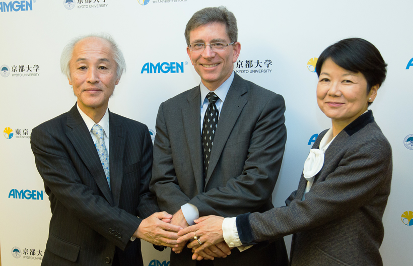 From left, Kyoto University Executive Vice-President Toshio Sugiman, Amgen Inc Vice President David M Reese, University of Tokyo Executive Vice President Masako Egawa