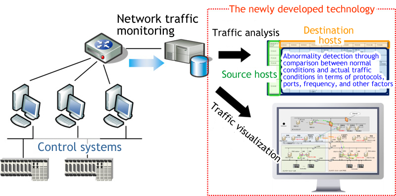 First, this newly developed technology saves data on traffic flows in the control system in its normal condition as a "white list". Then, this list and actual behavior of the control system network are compared over time in order to detect the differences between them, which indicate unexpected incidents in communication, such as increases in traffic or communication with unknown IP addresses, both of which could be caused by malware infection.