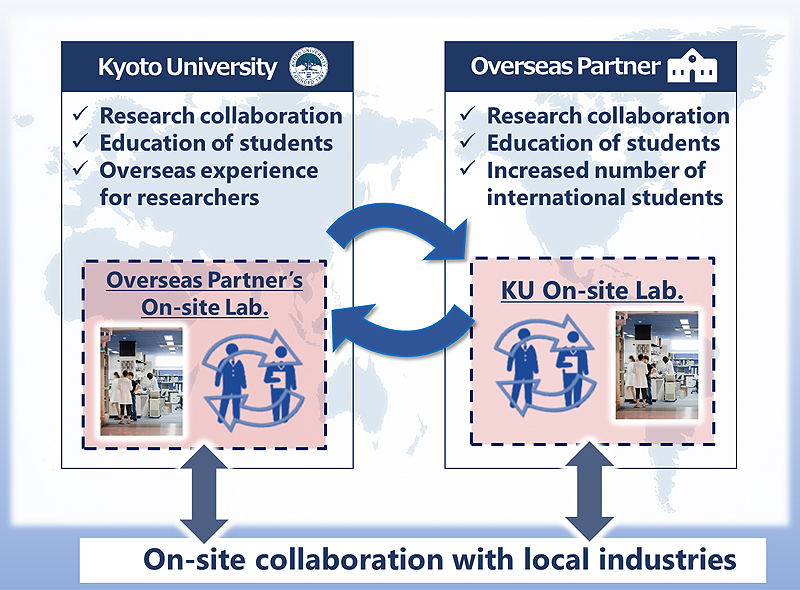Kyoto University launched an 'on-site laboratory' initiative in September 2018 as part of a strategy implemented under the education ministry's Designated National University (DNU) program. The initiative involves KyotoU departments/centers and their overseas partners collaboratively establishing laboratories, each to be hosted by either or both of the participating institutions and locally managed.