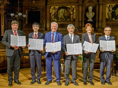 The signing of the joint statement (from left): VP Thomas Hirth (Karlsruhe Institute of Technology), EVP Toshiya Ueki (Tohoku University), Rector Bernhard Eitel (Heidelberg University), President Juichi Yamagiawa (Kyoto University), VP Hiltraud Casper-Hehne (University of Göttingen), and President Shojiro Nishio (Osaka University)