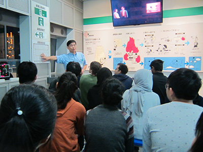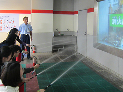 In part two, the students moved to the Kyoto City Disaster Prevention Center for simulated earthquake, fire-fighting, and evacuation experiences. The earthquakes were of the horizontal type, and ranged in intensity from four to seven on the Japanese seismic intensity scale. This session was followed by a lecture on how to prepare for and respond to such events. Participants next learned how to use a fire extinguisher by tackling a virtual fire projected on a screen. The final session, focusing on evacuation, featured a realistically simulated hotel fire, which presented a rare opportunity to experience the challenge of finding a way out of a smoke-filled building.