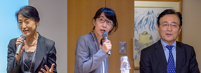 From left: Professor Yukari Mitsuhashi, vice-Director of Kyoto University's International Strategy Office, serving as the mistress of ceremonies, Professor Kayo Hirakawa (Kyoto University) delivering a keynote lecture, and Provost/EVP Minato greeting the reception attendees